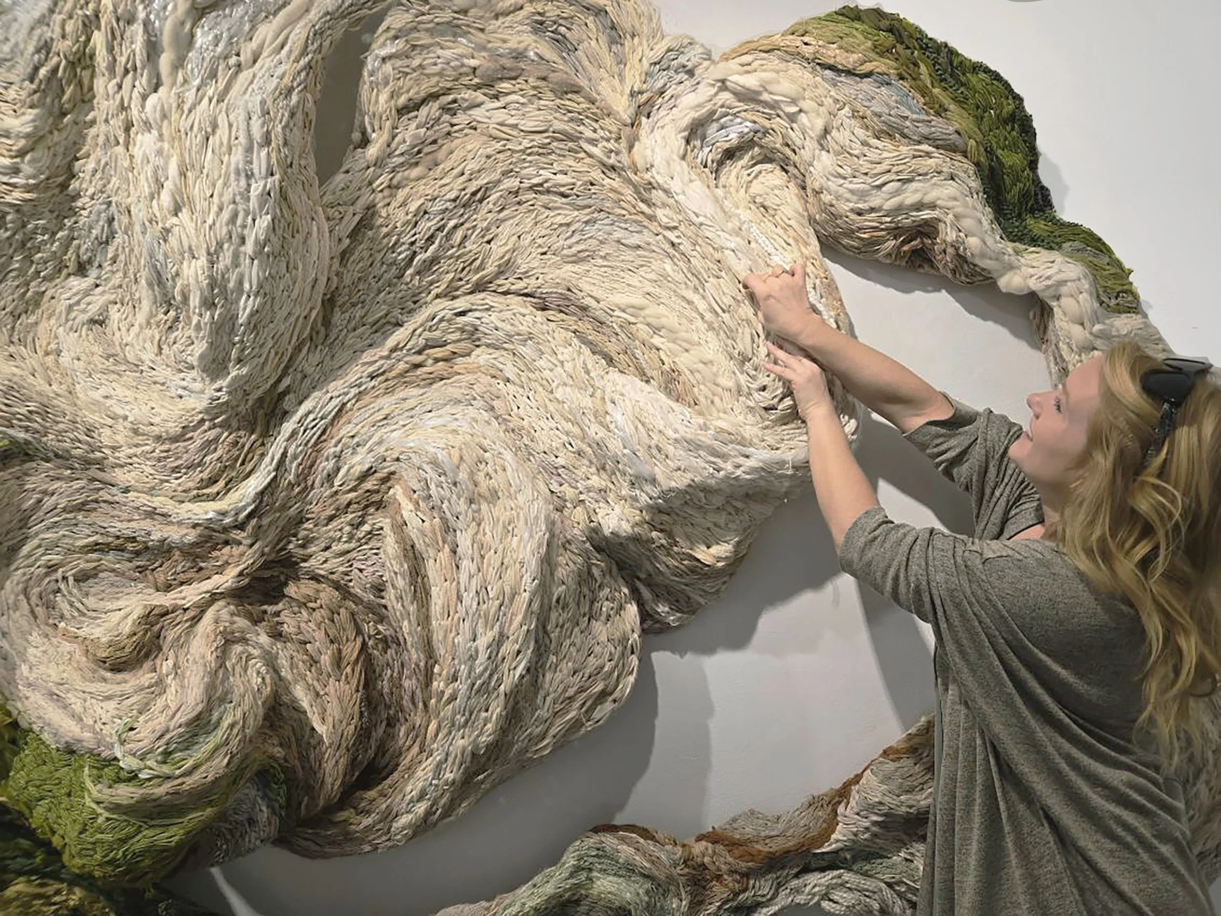 Handwoven tapestries and sculptures with recycled materials including plastic bags, clothing, hand dyed fibers, glass beads, bone and wire.